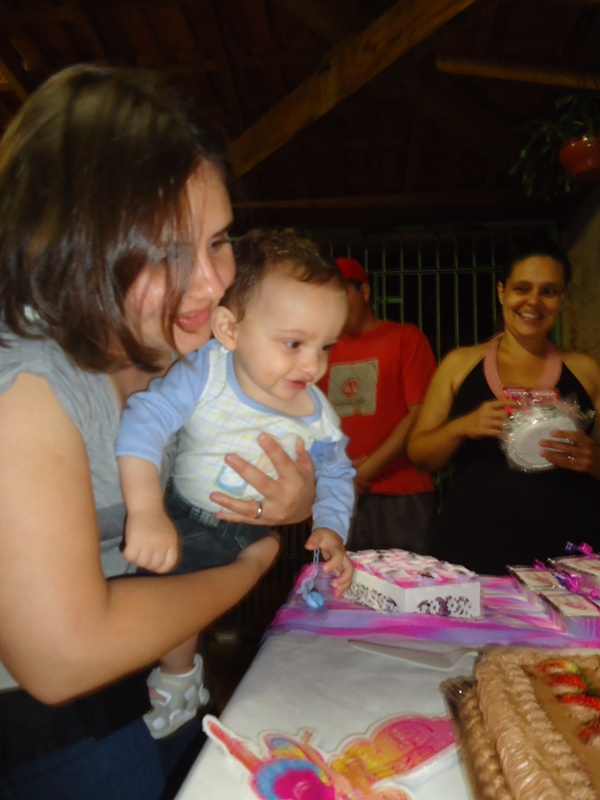 E teve bastante risadas, muita correria pois montamos no fundo da casa da sogra, mas no meio da festinha começou a chover e levamos tudo pra garagem. Era gente correndo com a mesa do bolo, outros carregando a comida... muitas risadas!!!
